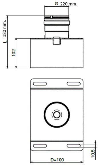 Piastra ancoraggio con scarico per uso interno, in acciaio inox, spessore 0,5 mm.., realizzato mediante processi automatici i quali saldatura laser longitudinale, bicchieratura femmina con particolare sistema" click-clak" esclusivamente dal diametro 80 al 200 compreso che facilita e velocizza l' installazione, diametro 220 mm.. tubi fumo per stufe a legna e pellet possono raggiungere una temperatura d'esercizio di 200° con guarnizione siliconica e 600° senza guarnizione siliconica.