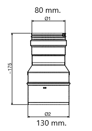 Riduzione femmina-maschio per uso interno, in acciaio inox, spessore 0,5 mm., realizzato mediante processi automatici quali saldatura laser longitudinale, bicchieratura femmina con particolare sistema "click-clak" esclusivamente dal diametro 80 al 200 compreso che facilita e velocizza l'installazzione, diametro 80 mm femmina e diametro 130 mm maschio.. tubi fumo per stufe a legna e pellet possono raggiungere una temperatura d'esercizio di 200° con guarnizione siliconica e 600° senza guarnizione siliconica.