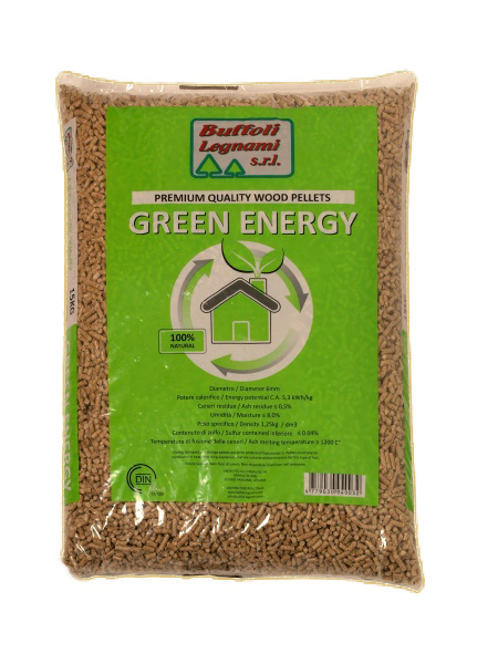 1 Sacco di Pellet Green Energy, certificato EnPlus A1, 100% abete (consigliato per stufe e caldaie).