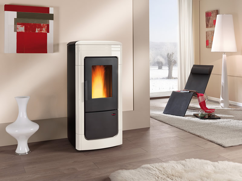 Termostufa a pellet con rivestimento in maiolica color madreperla, potenzxa 24,7 kWM - 22,8 kWN / 20,1 kW resi all'acqua, cassetto cenere estraibile, braciere autopulente, scambiatore di calore con sistema di pulizia manuale, termostato di sicurezza, pompa di circolazione, vaso di espansione, valvola di sicurezza 3 bar, telecomando in dotazione. Certificazione di qualità ambientale: 4 stelle.